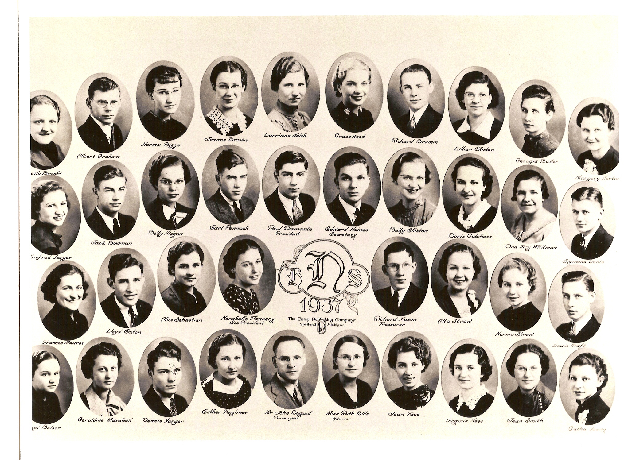 The Camp Publishing Company, Ypsilanti-Michigan Top Row: Ella (sp) Breski, Albert Graham, Norma Biggs, Jeanne Brown, Lorraine Welch, Grace Wood, Richard Brumm, Lillian Eliston, Georgia Butter Margery Norton 3rd Row: Winfred Yarger, Jack Bonman, Betty Hidgon, Earl Pennock, Paul Diamante (President), Edward Haines (Secretary), Betty Elliston, Doris Gutchess, Ona May Whitman, Sigmond Lenio 4th Row: Frances Maurer, Lloyd Eaton, Alice Sebastian, Norabelle Flannery (Vice President), Richard Mason (Treasurer), Etta Strow, Norma Strow, Louis Kraft Bottom Row: (?) Belson, Geraldine Marshall, Dennis Yarger,
